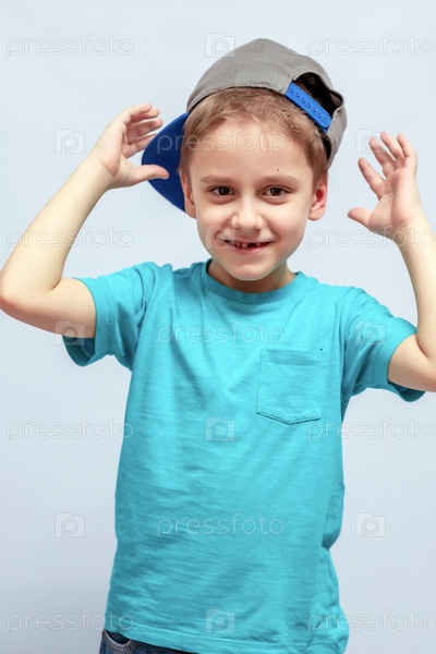 Улыбающийся мальчик, одетый в бирюзовую рубашку и серую шляпу, игриво позирует с поднятыми руками