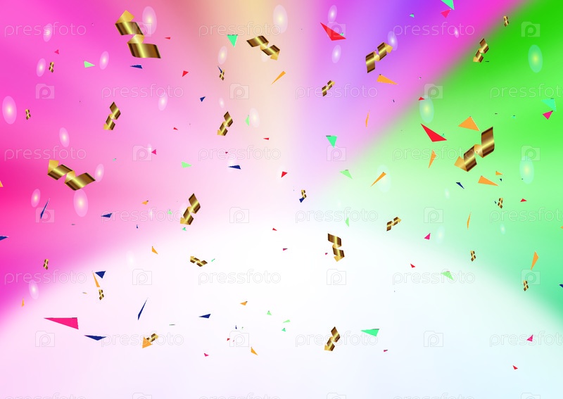 Красочные конфетти и золотые ленты плавают на ярком градиентном фоне с розовыми, зелеными и фиолетовыми оттенками, создавая праздничную атмосферу