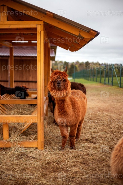 Альпака стоит на соле рядом с деревянным укрытием, в окружении огороженного поля.У нее пушисто-коричневое меховое покрытие и спокойное выражение лица.В укрытии видны другие альпаки, над ними облачное небо