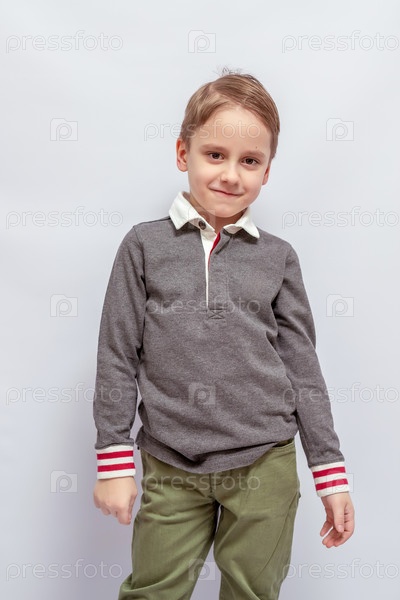 Молодой мальчик с светло-коричневыми волосами, одетый в серую рубашку с длинными рукавами с белым воротничком и красноокрашенными рукавами в паре с оливково-зелеными брюками