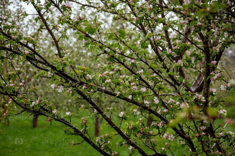 Ветви цветущего дерева с нежными розовыми и белыми цветами, окруженные пышной зеленью.На заднем плане изображено больше деревьев, создавая ощущение расцветного сада