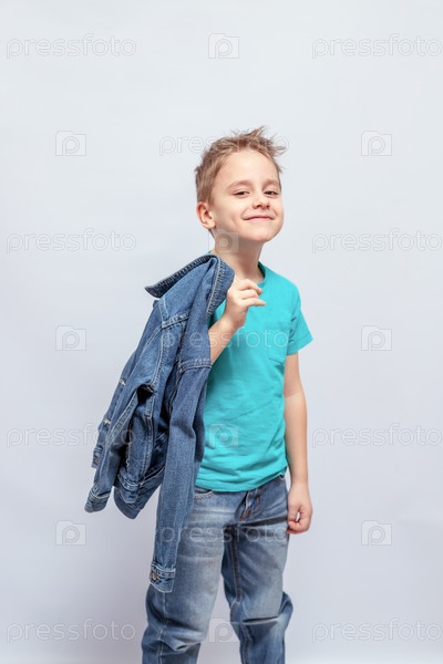 Маленький ребенок уверенно улыбается, держа джинсовую куртку на одном плече, одет в бирюзовую футболку и джинсы, с короткими волосами, излучая игривое и очаровательное поведение