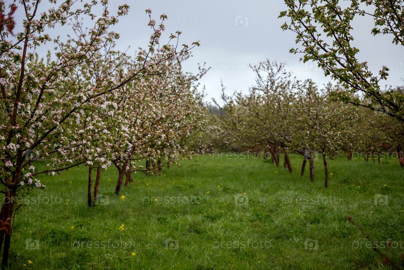 Яблоневый сад с рядами цветущих деревьев, ветвей украшенных нежными белыми цветами. пышная зеленая трава покрывает землю, а небо облачное и излучает мягкий свет