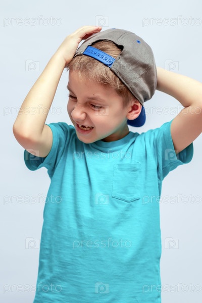 Мальчик в серой и синей шляпе назад, с закрытыми глазами и игривым выражением лица.Он одет в ярко-синюю футболку, играюще держит свою шапку обеими руками
