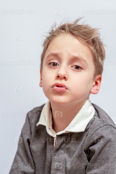 Маленький ребенок с запутанными волосами, одетый в серую рубашку и белый воротник, задумчиво смотрит вперед. выражение любопытное и созерцательное, при мягком естественном освещении