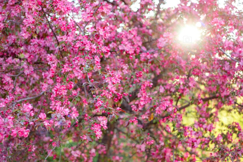 Розовые цветы плотно покрывают ветви деревьев, создавая яркую пышную сцену, купающуюся в мягком солнечном свете. Яркие солнечные лучи проникают сквозь ветви, улучшая красоту и цвет цветов