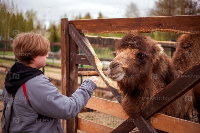 Человек в сером куртке, кормящий верблюда через деревянный забор с деревьями и парком на заднем плане