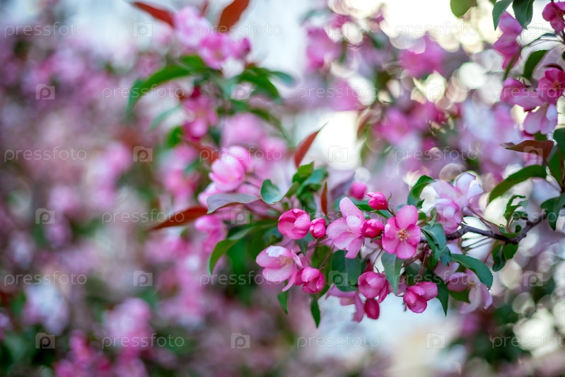 Розовые цветы в полном цветении на ветвях с зелеными листьями, некоторые почки видны.Несколько цветов частично размыты на заднем плане, создавая мягкий, мечтательный эффект