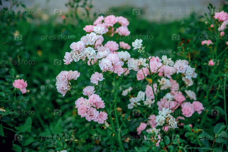 Нежные кластеры розовых и белых цветов пышно распускаются среди зеленых листьев, создавая спокойную и яркую природную сцену.Детальные лепестки изображают различные оттенки пастельного цвета