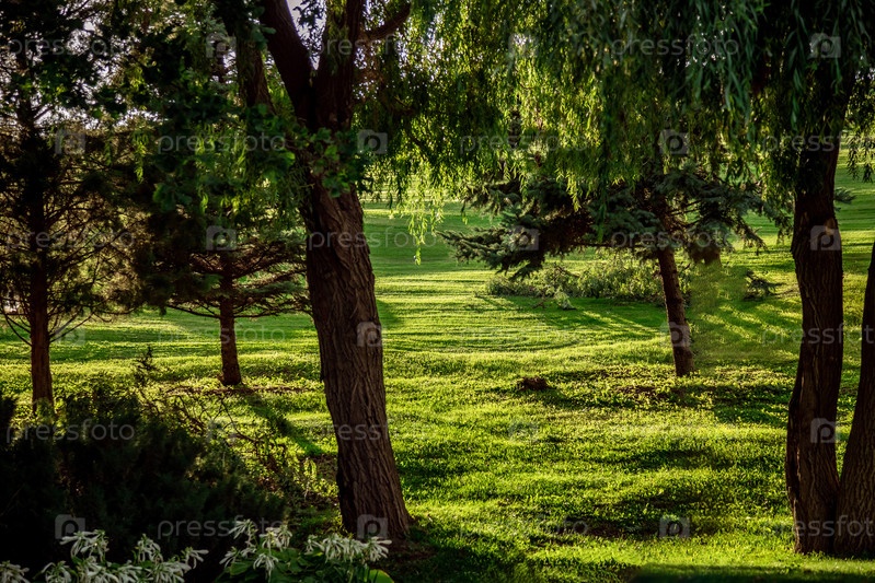 Плодородная парковая сцена с высокими деревьями, отбрасывающими тень на яркую зеленую траву. Солнечный свет фильтруется через листья, создавая пятнистые световые узоры. Спокойная и безмятежная природная среда