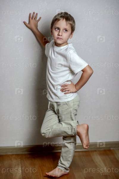 Маленький мальчик стоит в помещении, одет в белую рубашку и бежевые брюки, опирается на стену с поднятой одной ногой, рука лежит на стене, обдуманное выражение лица