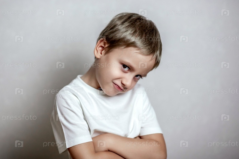 Маленький мальчик в белой рубашке с короткими волосами, злобно улыбающийся со скрещенными объятиями; мягкое освещение улучшает игривое, уверенное выражение на его лице