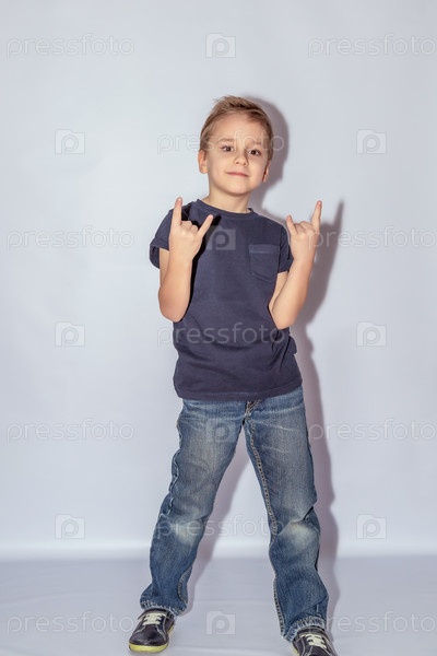 Молодой мальчик в синей рубашке и джинсах уверенно стоит, делая жесты руками рок-н-ролла, показывая игривое выражение лица