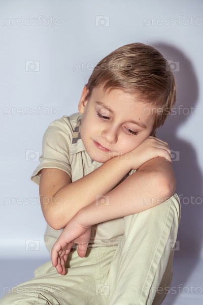 Маленький мальчик с светлыми волосами, одетый в легкую одежду и сидящий с подбородком, опирающимся на руки. он задумчиво смотрит вниз, бросая мягкую тень. его выражение спокойно и отражательно
