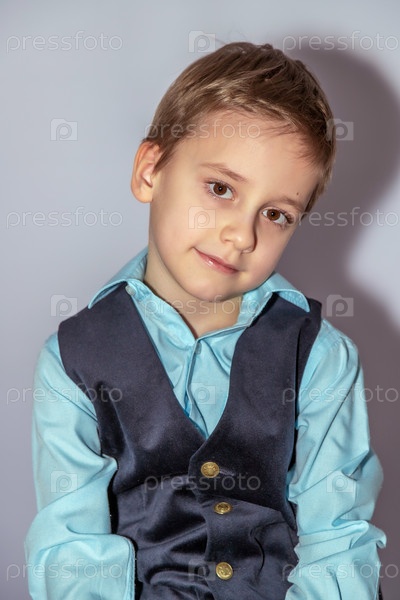 Маленький мальчик в светло-синей рубашке и темном жилете смотрит слегка боковым взглядом с мягким выражением лица. тень падает на одну сторону. волосы мальчика короткие и аккуратно расчешенные