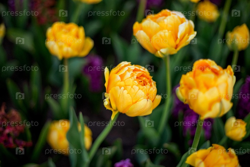 Желтые тюльпаны в полном цветении стоят среди зеленых листьев в саду, дополненных нефокусными фиолетовыми цветками на заднем плане, создавая яркий и красочный дисплей