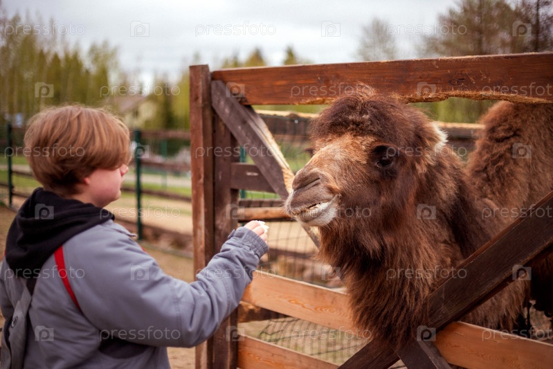 Молодой человек в серой куртке с красным рюкзаком смотрит на верблюда за деревянным забором. Верблюд, обладающий коричневым мехом, оглядывается назад на человека. Вдали видны деревья