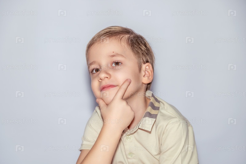 Маленький ребенок с светлыми волосами, одетый в легкую рубашку со полосатой воротничкой, положит подбородок на руку и задумчиво смотрит, делая позу, которая передает созерцание и любопытство