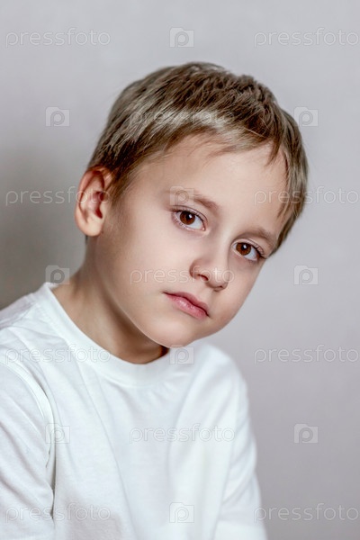 Нейтральное выражение лица и мягкое освещение подчеркивают черты ребенка на простом фоне