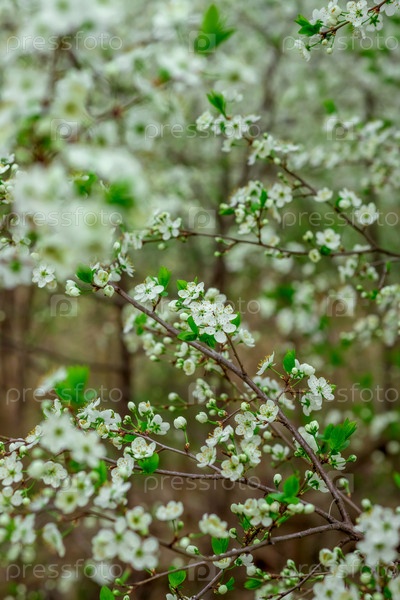 Белые цветы с нежными лепестками и свежими зелеными листьями на тонких ветвях. мягкий фокус фона улучшает мечтательную, весеннюю атмосферу