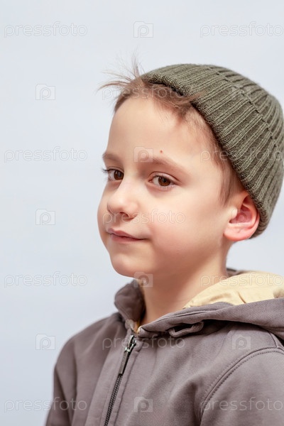 Маленький ребенок с задумчивым выражением лица носит серую толстовку и зеленую вязанную шапочку, стоящую в профиле.Клауз-ап захватывает их любопытный взгляд и юношескую невинность