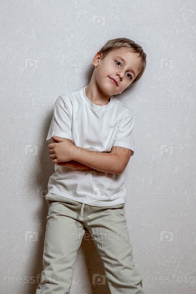 Маленький мальчик с короткими волосами стоит на светло-текстуровой стене, одет в обычную белую футболку и светлые брюки, руки скрещенные, смотрит в сторону