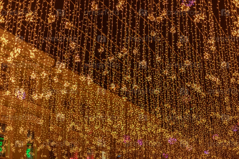 Золотые огни каскадируют в вертикальные нити, создавая очаровательный рисунок на небе.Теплое свечение и мерцающий эффект вызывают праздничную атмосферу в городской обстановке