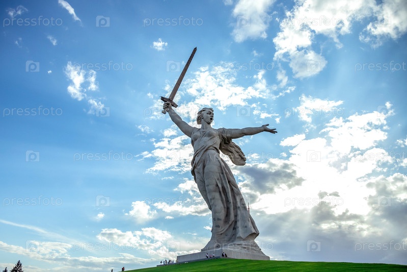 12.08.2025.Россия.Волгоград.Мамаев Курган.Высокая статуя одетой фигуры, держащей меч против драматического неба с рассеянными облаками.Под ним травянистый холм добавляет контраст яркому и обширному небу