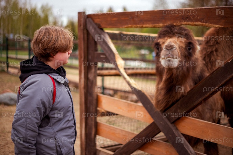 Ребенок в сером куртке с красными ремнями смотрит на верблюда через деревянный забор.Голова верблюда близка к ребенку.На фоне зелени и размытой тропы