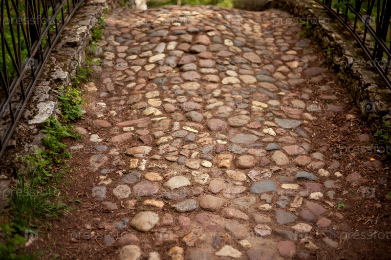 Пещеристый путь с неровными камнями ведет в гору, окрашенный рельсами из кованого железа и участками зеленой травы, создавая деревенскую, естественную атмосферу с землистыми тонами и текстурированными поверхностями