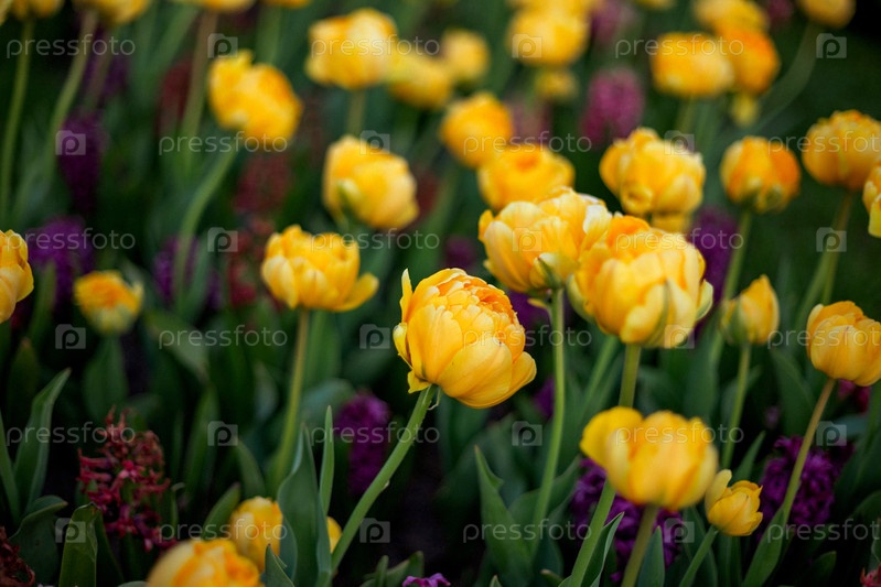 Желтые тюльпаны в цвете с намеками фиолетовых цветов среди пышных зеленых листьев, создавая яркую и красочную садовую сцену с мягким размытым фоном, подчеркивающим цветы