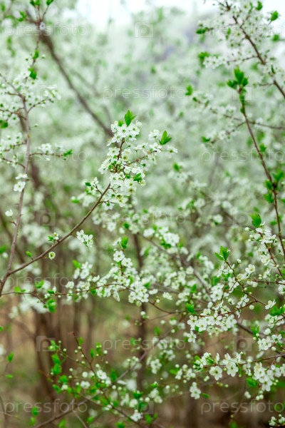 Нежные белые цветы плотно покрывают тонкие ветви, создавая пышную, яркую сцену.Маленькие зеленые листья добавляют контраст.Эффект боке размывает фон, улучшая глубину