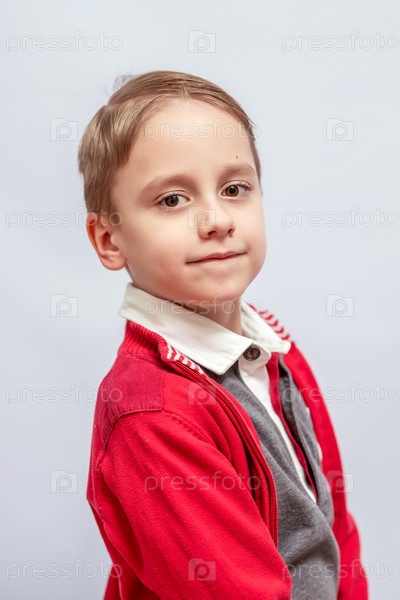 Маленький ребенок с короткими светло-коричневыми волосами, одетый в красный свитер на белой рубашке и серой футболке, смотрит мягко.У ребенка спокойная и тонкая улыбка, выражающая нежное поведение