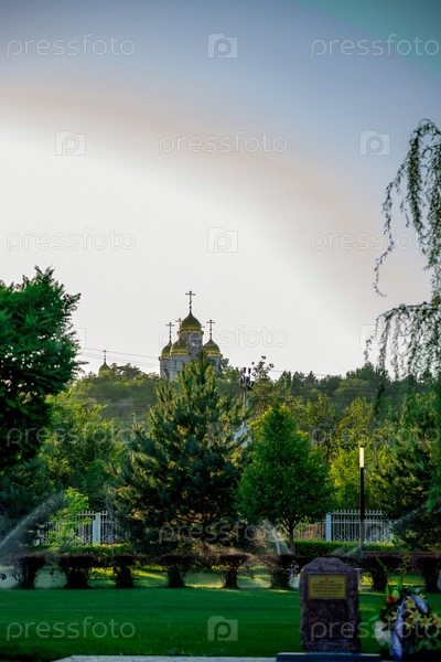 12.08.2025.Россия.Волгоград.Мамаев Курган.Православная церковь с золотыми куполами на фоне, окруженной пышными зелеными деревьями, ухоженным газоном и цветущими цветами вокруг каменного столба с табличкой, под ясным утренним небом