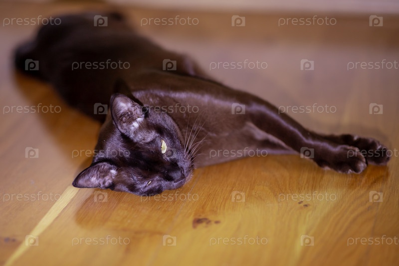 Гладкий темно-коричневый кот с ярко-зелеными глазами, лежащий на полированном деревянном полу и вытягивающий одну ногу