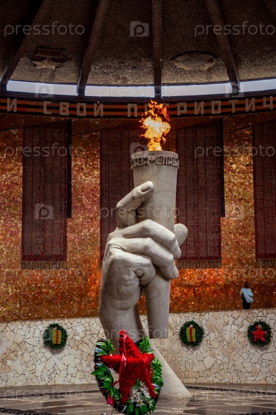 12.08.2025.Россия.Волгоград.Мамаев Курган.Большая скульптура руки держит факел с пламенем во внутреннем памятнике.Текст виден вверху. Веноки с красными лентами размещены спереди, под купольным потолком