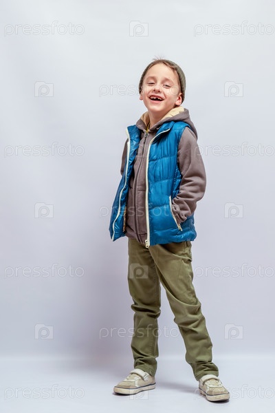 Улыбающийся маленький ребенок в повседневной одежде, включая голубой пузырьковый жилет, зеленые брюки и бежевые кроссовки, стоит с руками в карманах