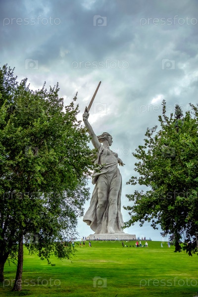 12.08.2025.Россия.Волгоград.Мамаев Курган.Высокая статуя женщины, держащей меч, стоит на зеленом холме, окруженном высокими деревьями по обе стороны.Облачное небо улучшает драматическую обстановку с маленькими фигурами рядом