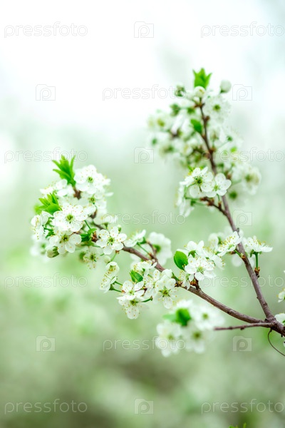 Ветка украшена нежными белыми цветами и ярко-зелеными листьями на мягком размытом естественном фоне.Композиция излучает свежесть и сущность весны