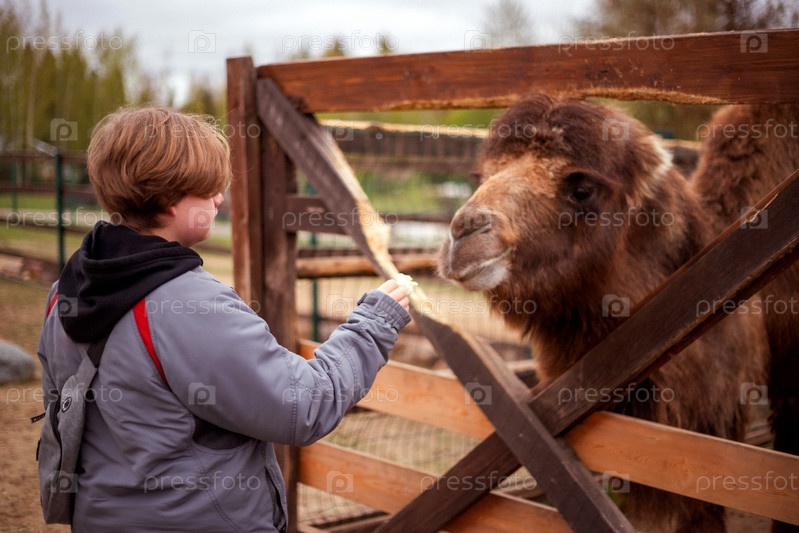 Человек с короткими волосами и серой курткой кормит верблюда через деревянный забор.Настройка выглядит как на открытом воздухе, возможно в дикой природе или зоопарке животных