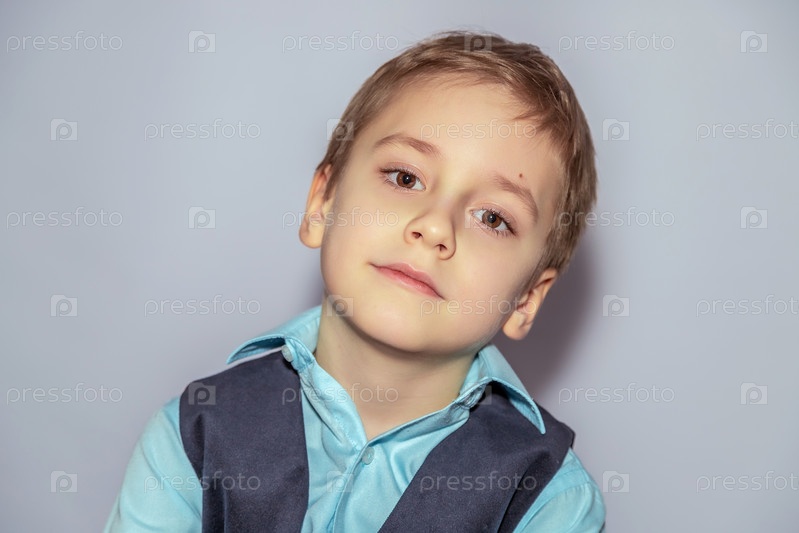 Маленький мальчик с короткими светло-коричневыми волосами носит голубую рубашку под темным жилетом, спокойно смотрит на камеру со слегка улыбкой, голова немного наклонена в сторону