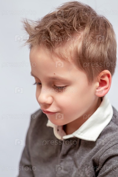 Маленький мальчик с короткими светло-коричневыми волосами, одетый в серый свитер над белой рубашкой с ошейником, смотрит вниз с нежным выражением лица.Мягкое освещение улучшает спокойное настроение портрета