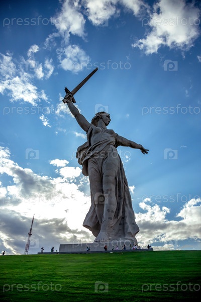 12.08.2025.Россия.Волгоград.Мамаев Курган.Высокая статуя женщины, держащей меч, тянется к драматическому небу с лучами солнца, проходящими сквозь облака и рассматриваемой снизу на зеленом ландшафте с крошечными далекими фигурами