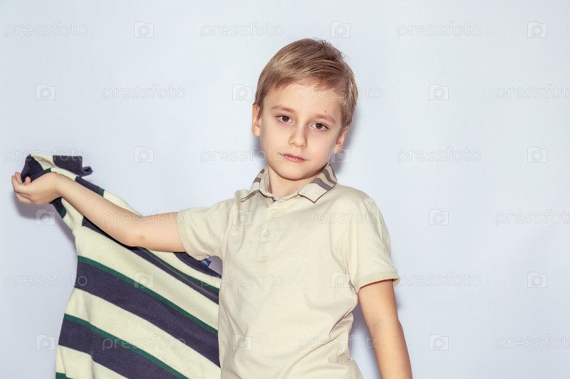 Маленький мальчик с короткими светлыми волосами в светлой футболке, держит полосатую рубашку в левой руке и уверенно смотрит на камеру