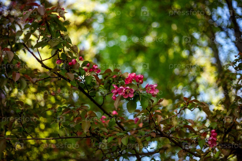 Розовые цветы на лиственных ветвях с солнечным светом, фильтрующимся через пышную зеленую листву. размытый фон создает эффект боке, подчеркивая яркие цветения и богатую зелени