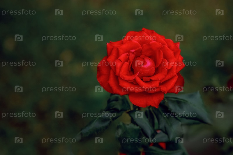 Вибрирующая красная роза с бархатными лепестками и темно-зелеными листьями, красиво цветущими