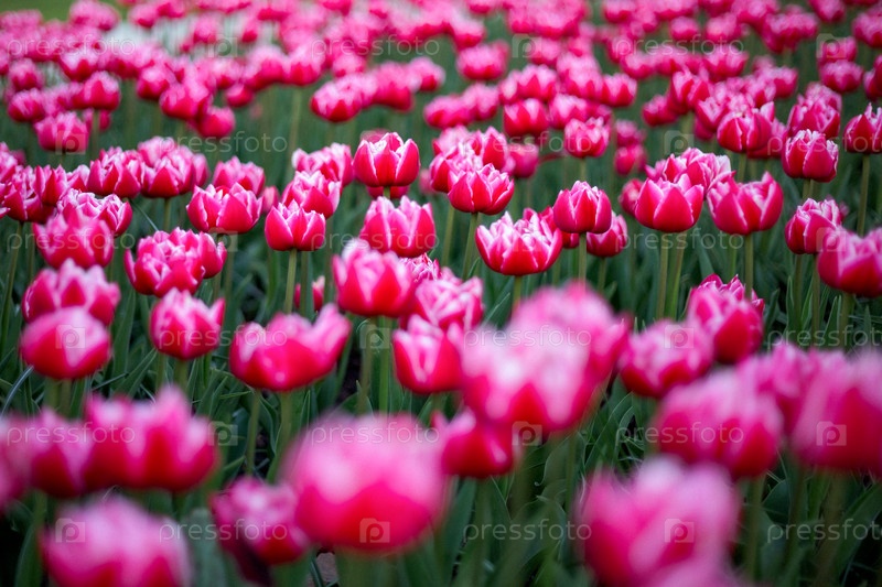 Живое поле, наполненное многочисленными розовыми тюльпанами в полном цветении. эффект мягкого фокуса создает мечтательную атмосферу. красно-белые вариации лепестков выделяются против пышных зеленых стеблей