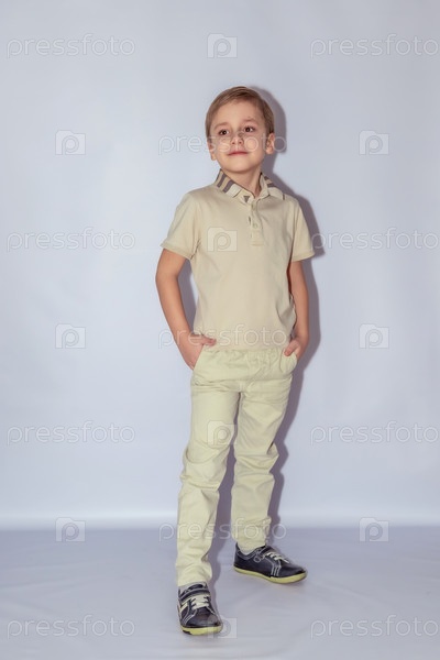 Молодой мальчик в бежевой футболке и брюках, руки в карманах, уверенно стоящий в студии. короткие светло-коричневые волосы, нейтральное выражение лица. носящие темные кроссовки с белыми подошвами