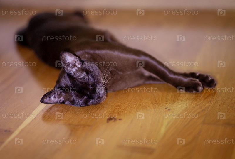 Спящий коричневый кот простирается на полированном деревянном полу, при этом мягкое освещение подчеркивает текстуру его шерсти и расслабленную осанку