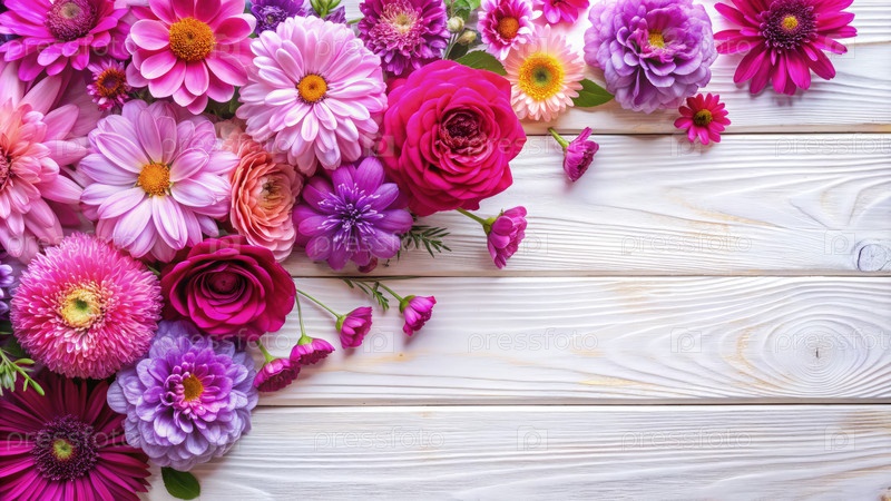 Яркое расположение ярких цветов, художественно размещенных на белом деревянном фоне, создает веселую атмосферу, идеальную для празднований или сезонного украшения
